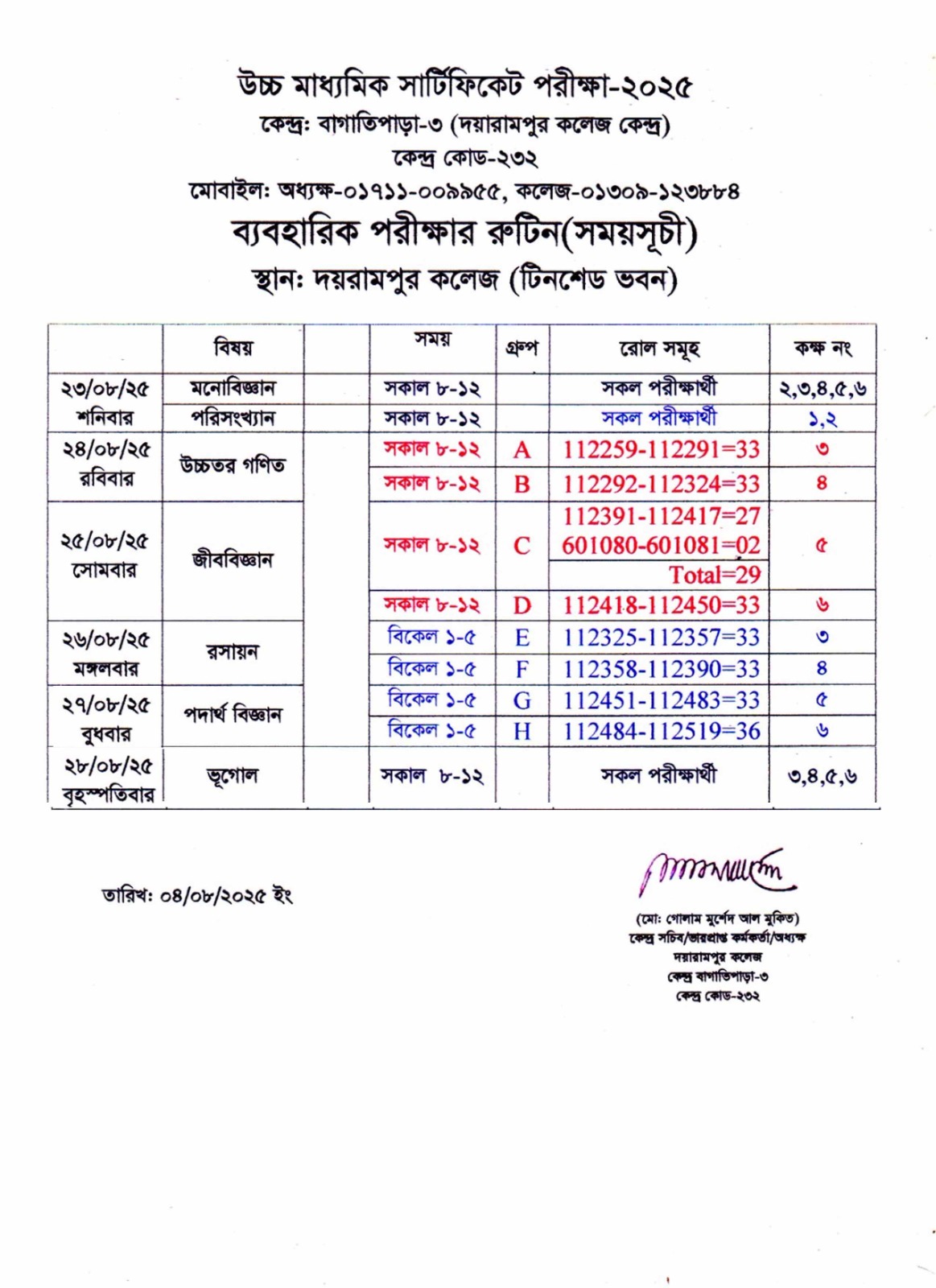 HSC 2025 সালের দয়রামপুর কলেজ কেন্দ্রের ব্যবহারিক পরীক্ষার সময়সূচী |